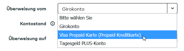 Eigentlich musst du einfach nur in deinem Persönlichen Bereich unter Konto & Karte auf Überweisung klicken und anschließend bei "Überweisung vom" dein Visa-Kartenkonto auswählen.