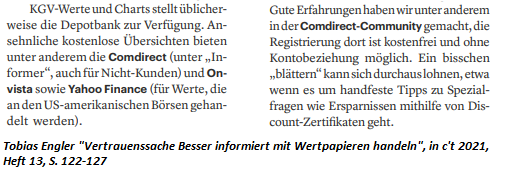 Ist eigentlich sonst noch jemand aufgefallen, dass in der aktuellen Ausgabe des EDV-Magazins "ct" sowohl der Informer (S. 124) als auch die Comdirect-Community (S. 127) in dem dort enthaltenen Finanz-Artikel positiv erwähnt wurde?