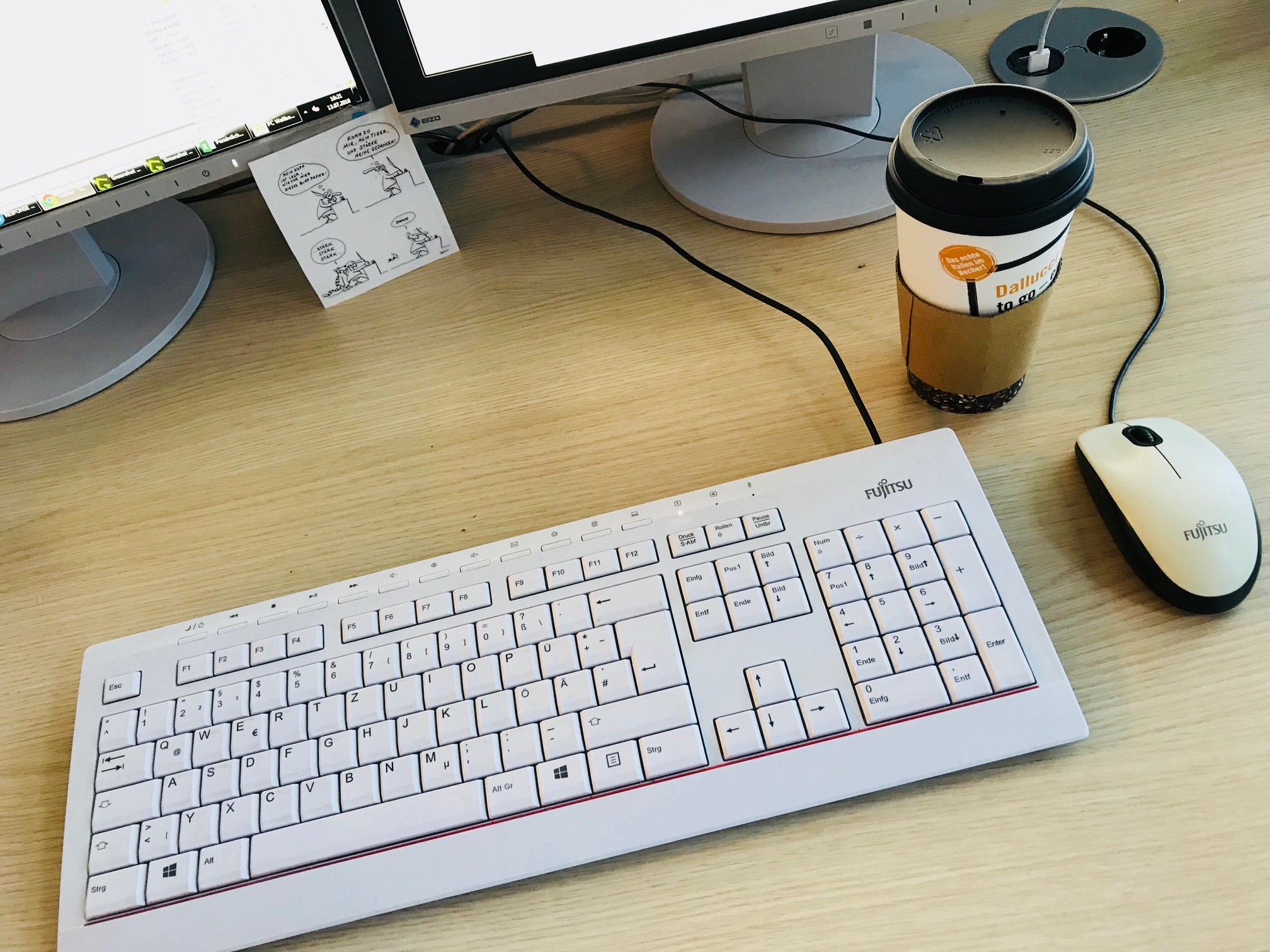 auf genauso die Tastatur hämmere ich auf Arbeit auch immer Blödsinn ein .. und an meinem Bildschirm hängen 2 zwei selbstgemalte "Bilder" von Kolleginnen.. Achja und die Teamorga, damit ich weiß, wie die Leute heißen, die mir so auf dem Gang begegnen 😉