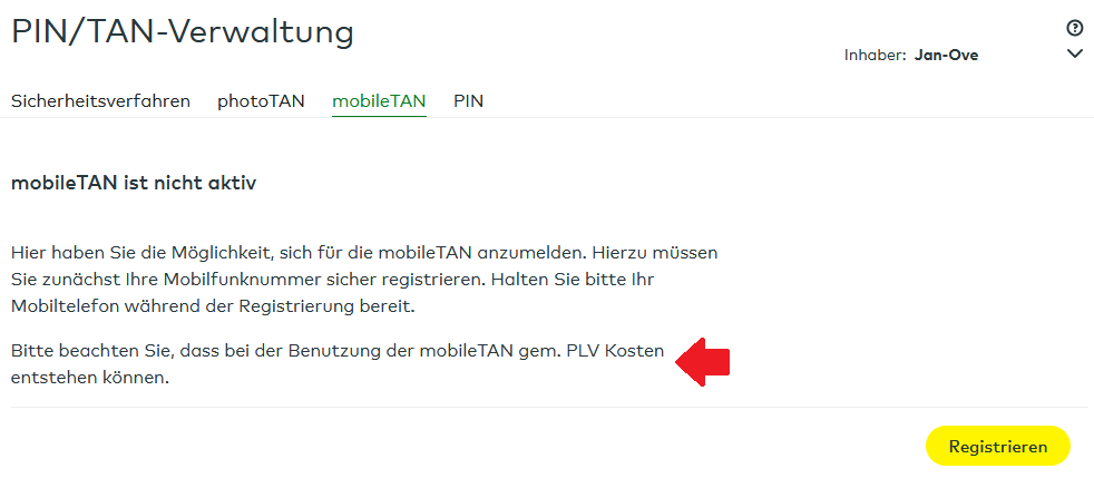 wir weisen direkt vor der Registrierung der mobileTAN auf die Entgelte hin: