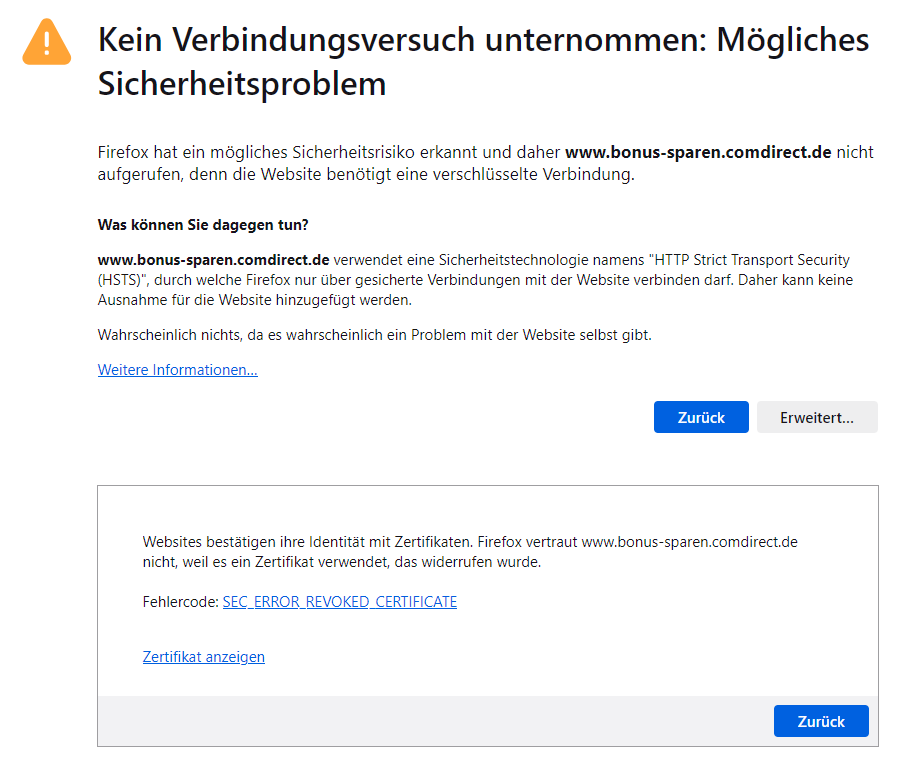 Bonus Sparen SEC_ERROR_REVOKED_CERTIFICATE Fehler