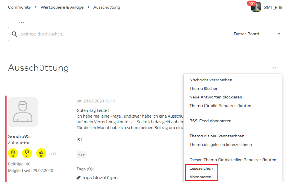 Um bestimmte Beiträge für dich zu markieren, kannst du sie im Thread-Menü entweder abonnieren (dann erhältst du bei jedem neuen Beitrag im Thread eine Nachricht, sofern du das in den Einstellungen deines Profils aktiviert hast) oder als Lesezeichen ablegen (die Liste der Lesezeichen - und auch der Abos - findest du in deinem Profil > Meine Einstellungen > Meine Abonnements und Lesezeichen).