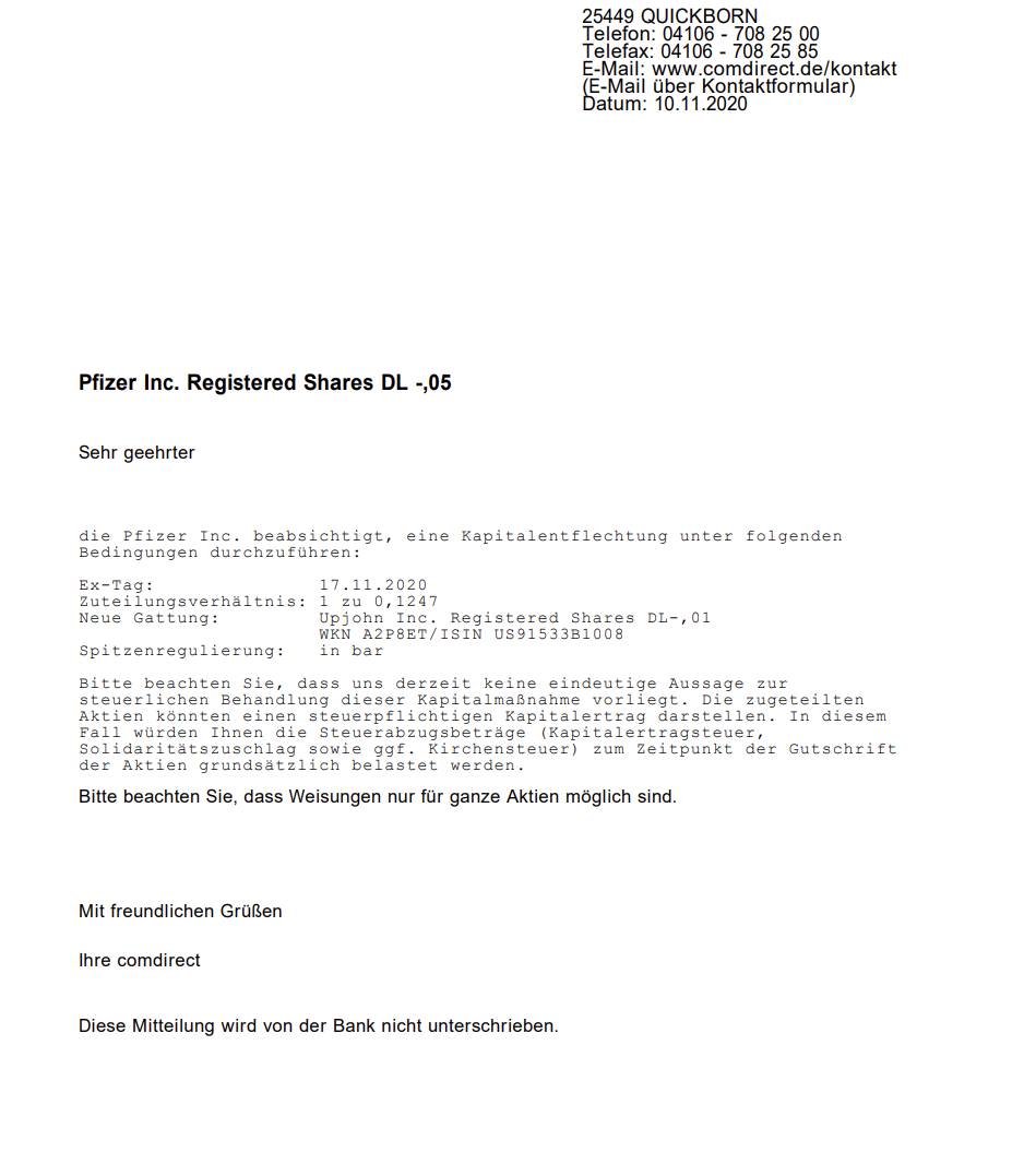 diese Maßnahme ist ein Spin-Off. Aus Pfizer wird Upjohn und Pfizer. Dies passiert obligatorisch du hast in diesem Sinne keine Wahlmöglichkeit.