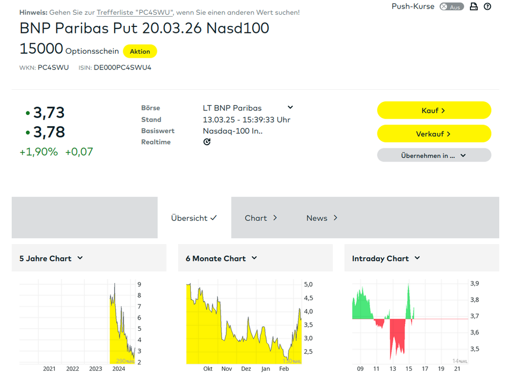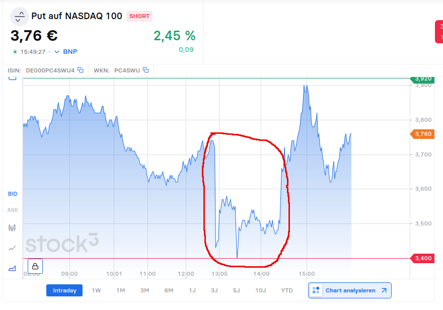 Die BNP scheint ganz offensichtlich ein Problem mit der Pricing-Engine gehabt zu haben. Es wurde kein Ask-Preis gestellt und der gestellte Bid-Preis war extrem niedrig, obwohl der Basis-Wert (NASDAQ 100) gefallen ist und dies eigentlich zu einem höheren Optionsschein-Preis hätte führen müssen. Anscheinend ist das Problem seitens BNP behoben.