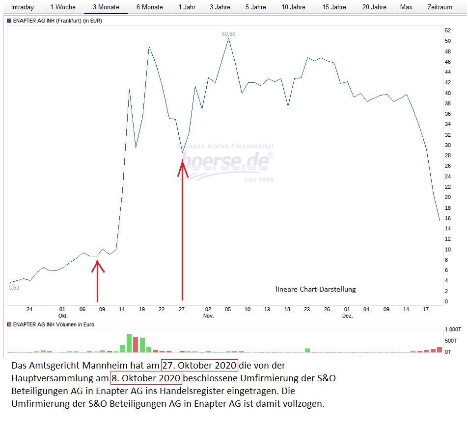 Durch Auslieferung der börsengehandelten Aktien an den Streubesitz hat sich die Anzahl der von Streubesitzaktionären gehaltenen, börsengehandelten Aktien von rund 77.000 Aktien auf nunmehr rund 775.000 Aktien deutlich erhöht. Quelle: (17.12.2020: PTA-News: Enapter AG: Auslieferung von börsengehandelten Aktien an Zeichner der Barkapit... )