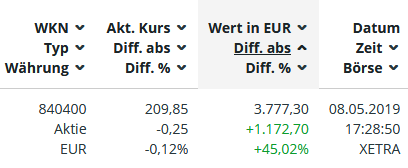 Das bedeutet zB Differenz absolut, also seit Kauf.