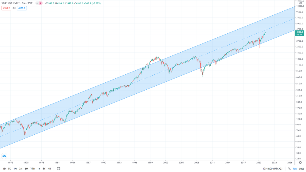 Dazu kommt die spezielle Situation heute. Sieh dir mal den S&P500 in logarithmischer Darstellung über die letzten 50 Jahre an: