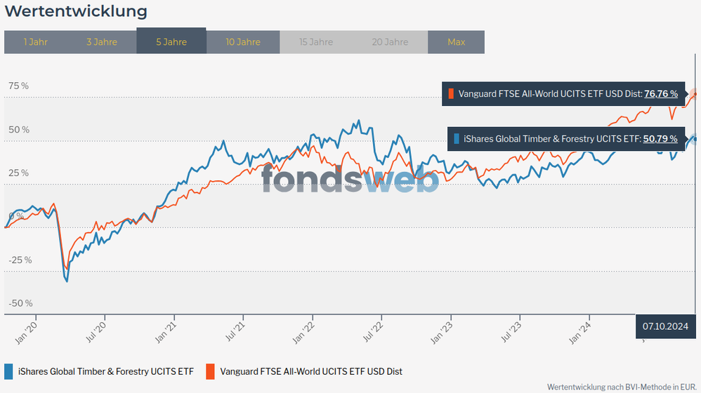 Einerseits finde ich das Thema "Holz- & Forstwirtschaft" sehr interessant, weil es viel mit der allseits gerühmten Nachhaltigkeit und der Bekämpfung des CO2-Anstiegs zu tun hat, andererseits ist die Kursentwicklung des Fonds seit Auflegung (Mai 2012), hier im Vergleich zum All-World, nicht wirklich berauschend: